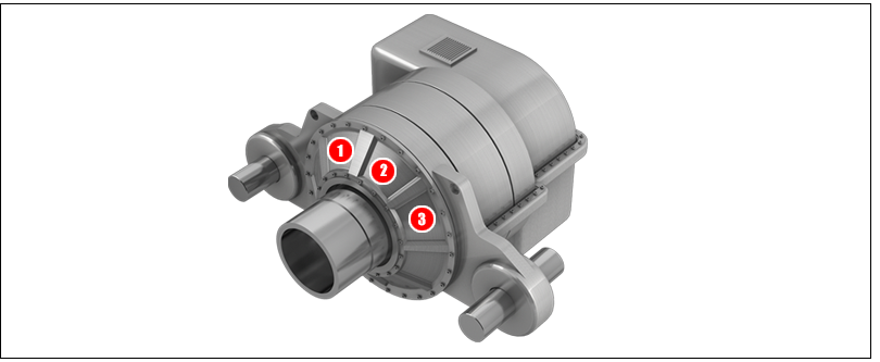 The majority of turbine designs feature a gearbox, although some manufacturers produce 'direct drive designs', which do not require one. The gearbox employs a planetary gear system to convert the low-speed high-torque rotation of the rotor into high-speed rotation at low torque for input to the generator. The gearbox drives a high speed shaft leading to the generator, typically at 1,5.
