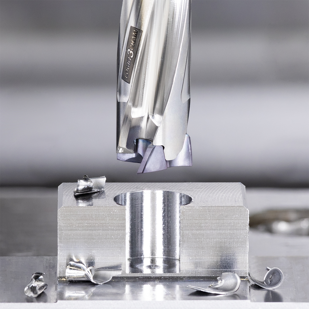 [Fig. 1 3-flute LOGIQ3CHAM drills provide nearly flat bottom holes.]
