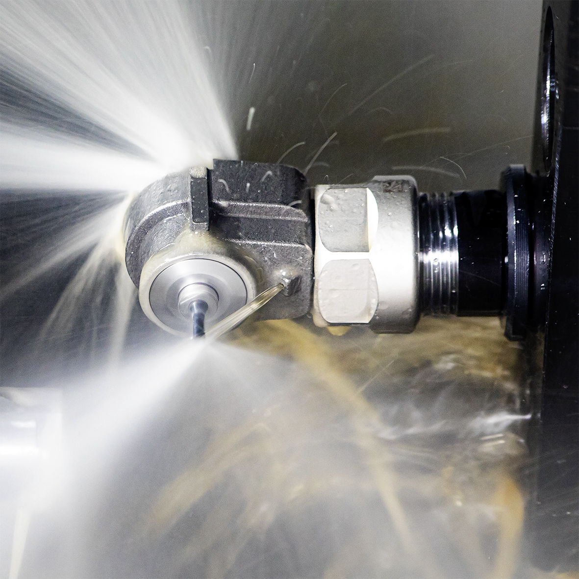 ISCAR SPINJET (Fig.4), a family of coolant-driven high-speed compact spindles for small diameter tools, intended to upgrade existing machines to high-speed performers, is now supplemented with Micro 90 intended for miniature rotating tools in milling, drilling, countersinking, thread milling, engraving, chamfering and deburring operations. Micro 90, made of a solid titanium shell and assembled from only six parts, enables rotating velocities that range from 35000 to 53000 rpm while the main machine spindle remains idle.