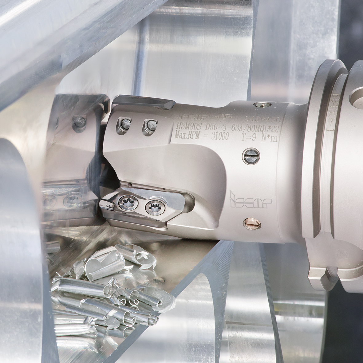 Fig. 2- Indexable milling cutters for machining aluminum at extremely high cutting speeds are specifically engineered to eliminate insert radial displacement, which may occur due to the high centrifugal forces.
